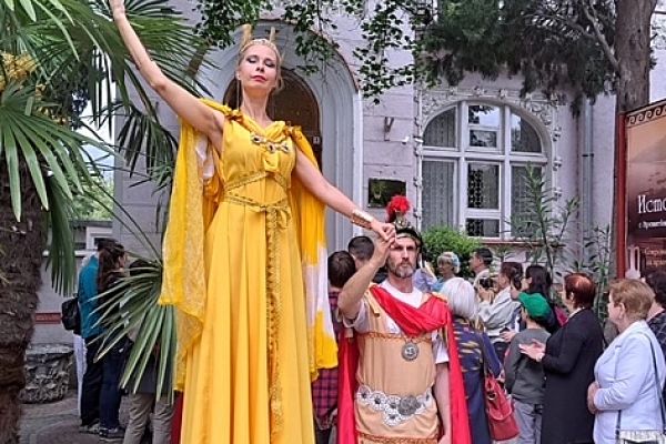 На ступенях старинного здания гостей встречали юные греки и гречанки в традиционных античных нарядах с золотыми ветвями оливы в руках, ведущие рассказали о древнегреческом мифе об Ифигении и пригласили гостей познакомиться с археологической коллекцией, освещающей историю античной Таврики и всего древнего мира.
