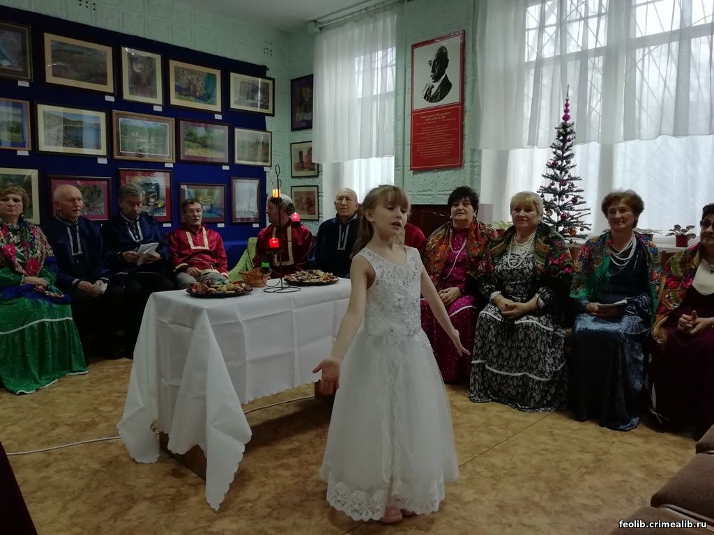 Красиво украшенный читальный зал библиотеки, новогодняя фотозона, книжные выставки - все создавало атмосферу волшебства и ощущения сказки. Маленькие артисты театра "Мельпомена" (творческий руководитель София Нестеренко) порадовали исполнением стихов и колядок. Празднование сопровождалось колядованием, переодеванием и исполнением святочных песен. Концертная программа народного хора ветеранов войны и труда "Красная гвоздика" (хормейстер Маргарита Зорина, аккомпаниатор Александр Бержаков, Заслуженные работники культуры Республики Крым) состояла из русских и украинских народных песен, песен о Рождестве. Вела программу участница хора, Заслуженный работник культуры РК Тамара Долгорукова. Маленьких и больших колядовщиков, подаривших хорошее настроение, благодарные зрители одарили аплодисментами и сладостями.