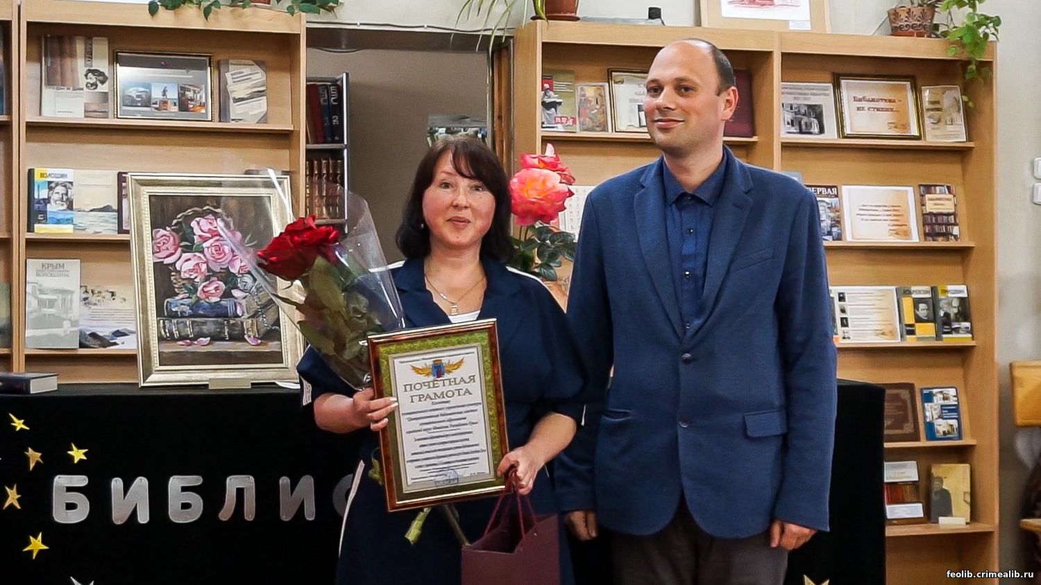 Почетные гости праздника - заместитель Председателя Феодосийского городского совета А. А. Пузанов, заместитель Главы администрации Ю. С. Некрасова, начальник Отдела по вопросам культуры Т. А. Стеблюк, поздравили библиотекарей с профессиональным праздником. От имени Администрации коллективу Централизованной библиотечной системы были вручены Почетная грамота, Диплом и Благодарность за многолетний добросовестный труд, высокий профессионализм, активное участие в культурных программах и проектах, значительный вклад в популяризацию и развитие библиотечного дела на территории муниципального образования городской округ Феодосия Республики Крым.