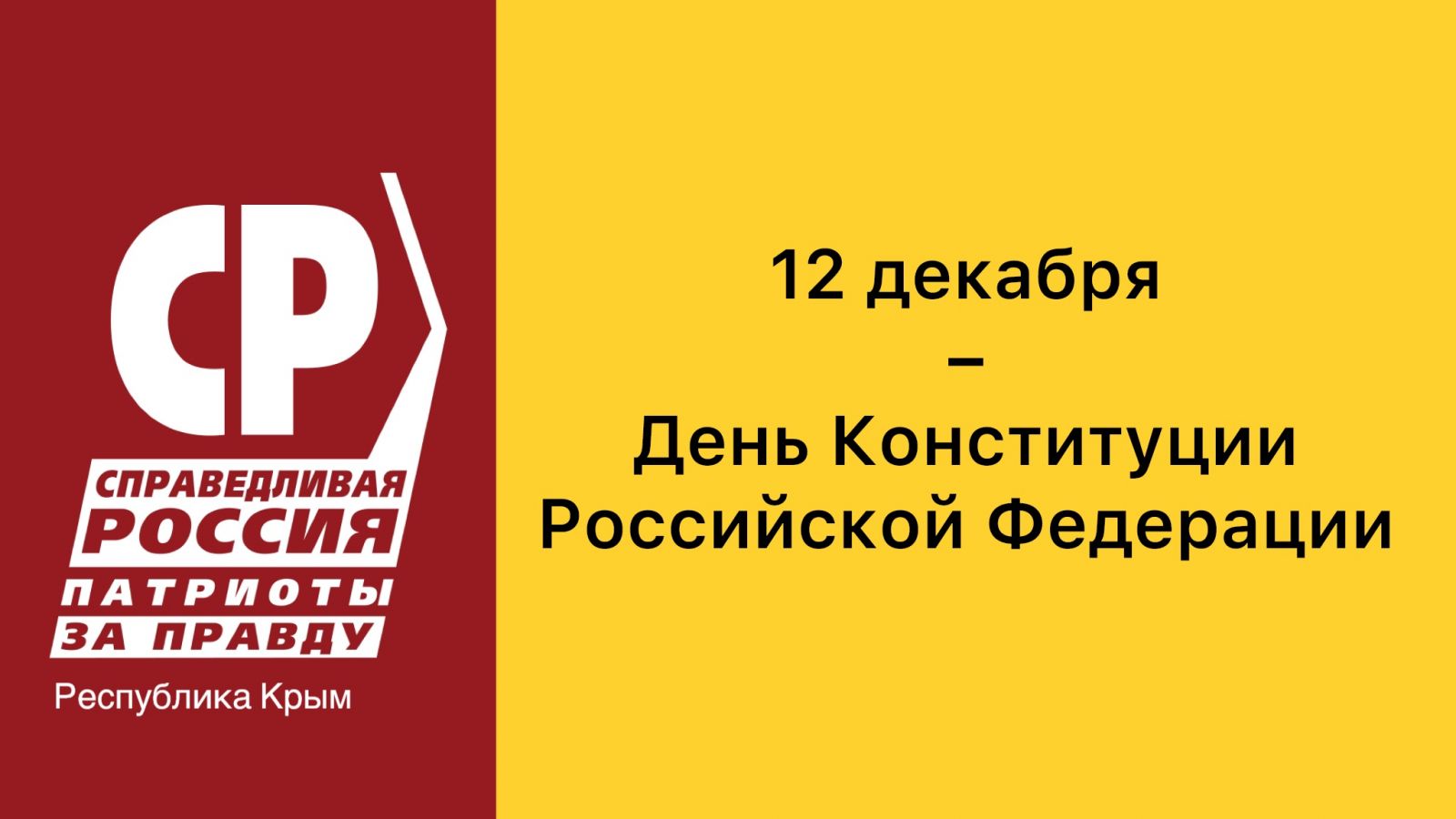 Крымчане! Региональное отделение Партии СПРАВЕДЛИВАЯ РОССИЯ – ЗА ПРАВДУ в Республике Крым поздравляет вас с Днём Конституции Российской Федерации! Каждый день мы ведём борьбу за соблюдение ваших прав. Обещаем и дальше работать в этом направлении!