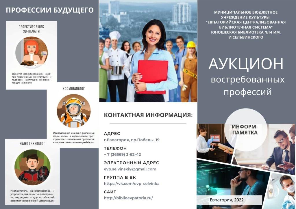 Сотрудники библиотеки подготовили для участников тренинга виртуальный обзор «Мир профессий открывает книга», виртуальные презентации «Необычные профессии мира» и «Профессии, связанные с бизнесом» , а также информ-буклеты «Ищи себя, пока не встретишь» и «Аукцион востребованных профессий».