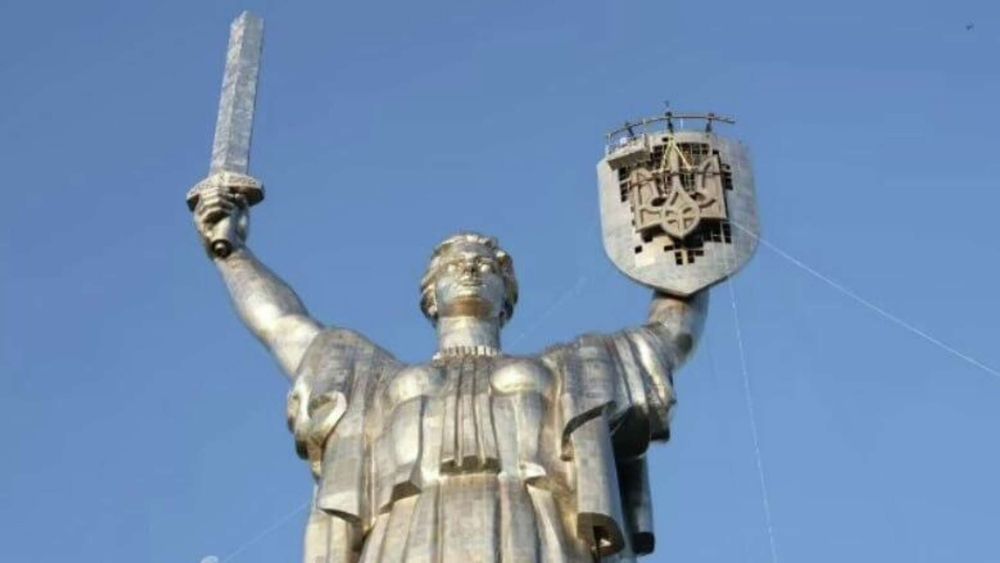 "На памятник Родины-матери в Киеве с утра установили украинский герб — трезубец", — говорится в публикации.