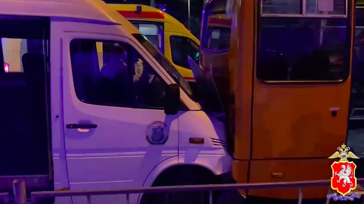 Фото: полиция СевастополяСегодня в 20:40 водитель маршрутного автобуса «Мерседес Бенц», двигаясь по улице Меньшикова в сторону проспекта Октябрьской Революции, в районе дома № 44 по улице Руднева врезался в стоящий впереди маршрутный автобус «Богдан», в котором также находились пассажиры.
