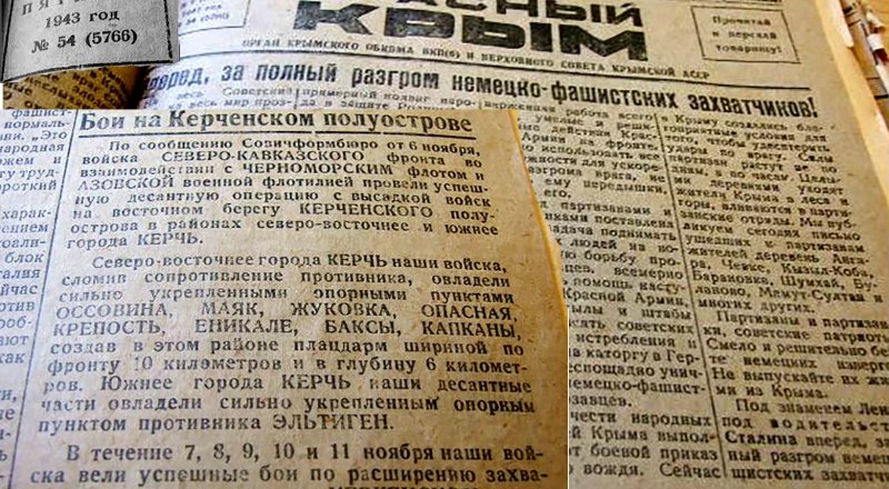12 ноября 1943-го слова «на днях» заменены на дату сводки. «Бои на Керченском полуострове. По сообщению Совинформбюро от 6 ноября, войска Северо-Кавказского фронта во взаимодействии с Черноморским флотом и Азовской военной флотилией провели успешную десантную операцию с высадкой войск на восточном берегу Керченского полуострова в районах северо-восточнее и южнее города Керчь. Северо-восточнее города Керчь наши войска, сломив сопротивление противника, овладели сильно укреплёнными опорными пунктами Оссовина, Маяк, Жуковка, Опасная, Крепость Еникале, Баксы, Капканы, создав в этом районе плацдарм шириной по фронту 10 километров и в глубину 6 километров. Южнее города Керчь наши десантные части овладели сильно укреплённым опорным пунктом противника Эльтиген. Неоднократные контратаки против наших высадившихся частей были отбиты. В течение 7, 8, 9, 10 и 11 ноября наши войска вели успешные бои по расширению захваченных плацдармов на Керченском полуострове». И рубрика с тех пор появилась в газете - «Бои на Керченском полуострове», писать о них старались регулярно.