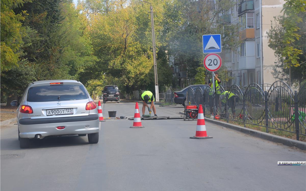 Подрядчик устанавливает "лежачего полицейского", ограничивая скорость автомобильного потока у пешеходного перехода рядом со сквером "Солнечный" по ул.