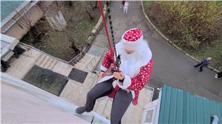 Спасатели спустились к детям на альпинистском снаряжении в костюмах Дедов Морозов.