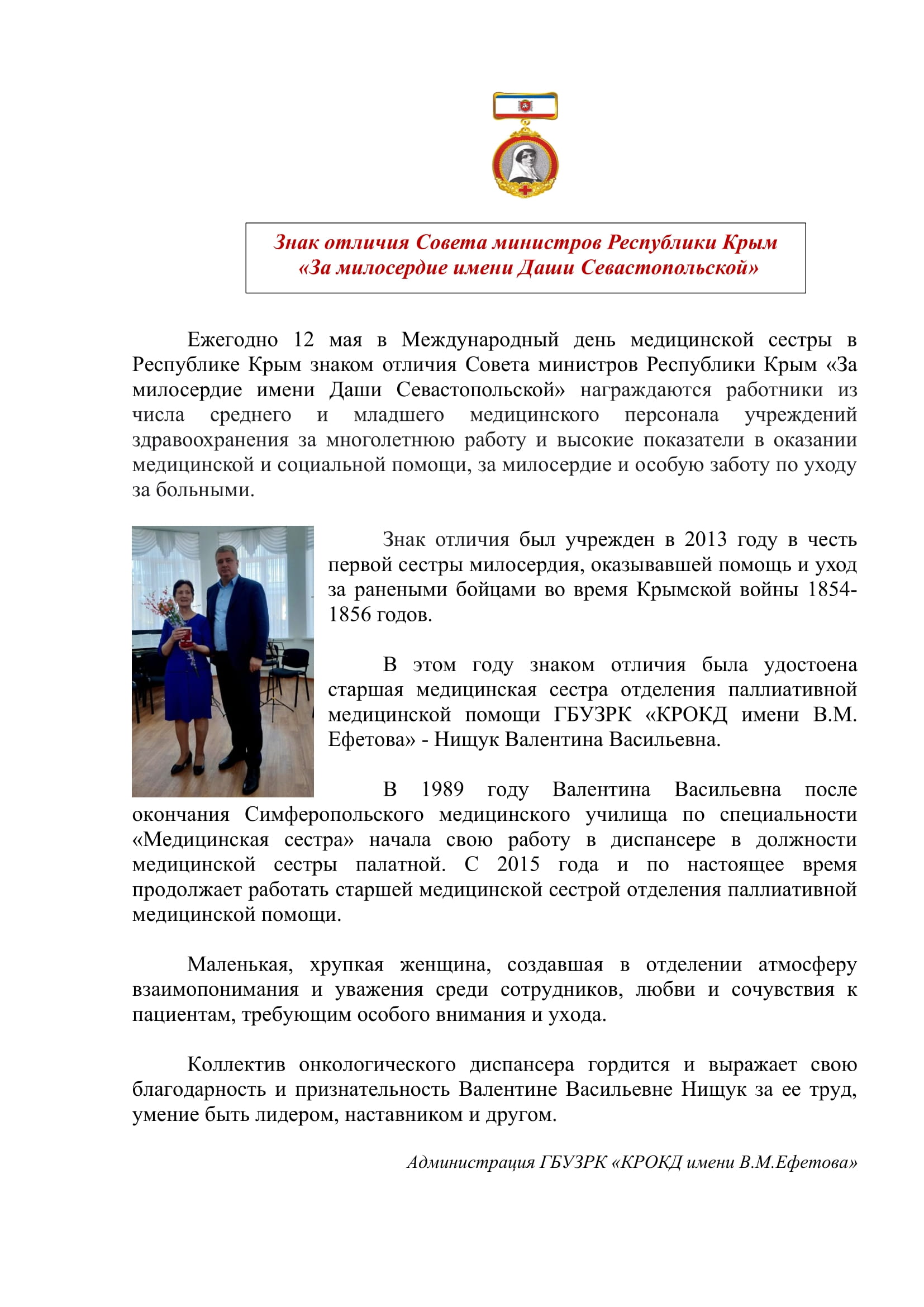 Знак отличия Совета министров Республики Крым «За милосердие имени Даши Севастопольской»